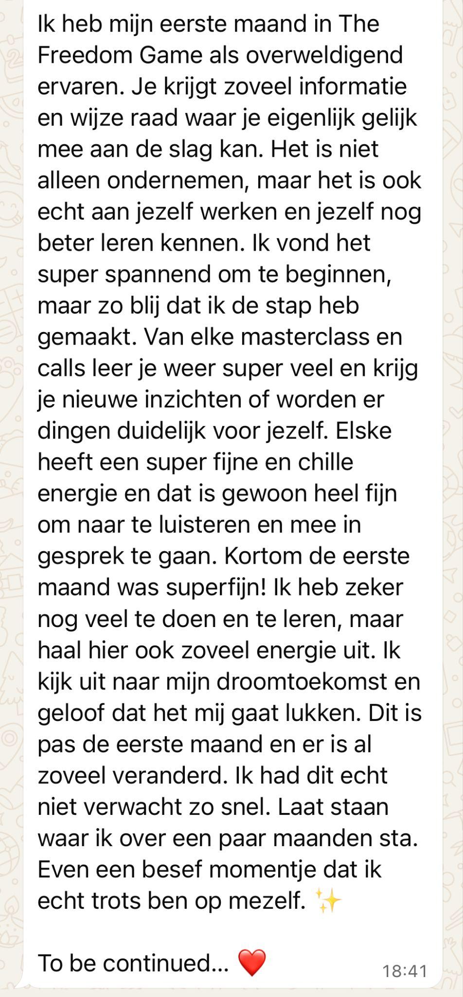 "Binnen drie maanden had ik mijn positionering helemaal helder, mijn aanbod stond en ik trok klanten aan die écht bij mij pasten. The Freedom Game heeft mijn hele business getransformeerd."