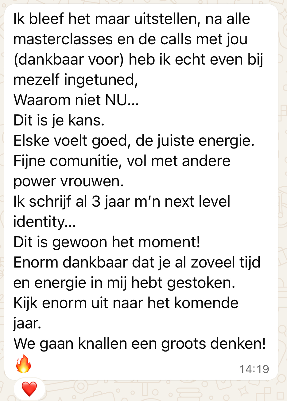 Dit is voor de vrouw die haar oude leven durft plat te branden en in zes maanden tijd haar next level volledig claimt. Samen bouwen we een premium business, een dominant brand en de meest succesvolle, sexy en zelfverzekerde versie van jou.